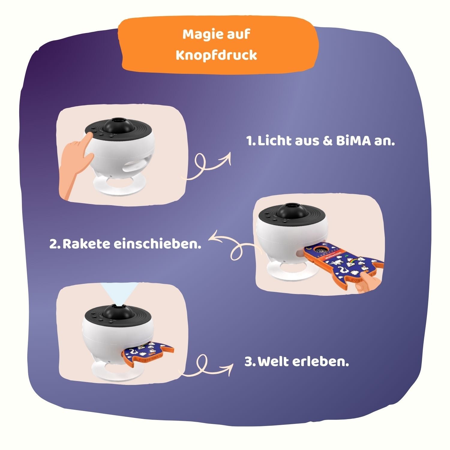 In einer Welt, in der es ständig Input gibt, gibt es selten Augenblicke, in denen wir ganz bei uns sind - vor allem mit unseren Kindern. Mit BiMA wird jeder Abend zur Reise in eine Fantasiewelt. Mit jeder BiMA Rakete taucht ihr gemeinsam in neue Welten ein - ganz ohne Bildschirm und im eigenen Kinderzimmer.